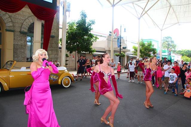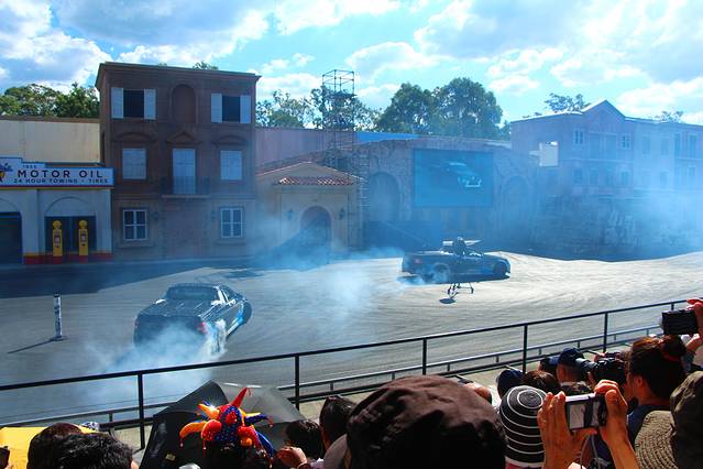 来正好赶上主街上的表演。不过没看两分钟就发现飞车秀门口已经排起了长队。飞车秀非常的有名,所以一天有两场,我们错过了早上的那场不能再错过下午的了,小吃货觉得还有半个多小时才开始的show肯定不会有人去排队的,坚持要去吃了饭再去排队,当时队伍已经拍到了另外一个游乐区了。不过还好我眼尖,赶紧拉着小吃货去排队,买了个热狗安抚一下吵着要吃饭的小吃货。胜利进入!