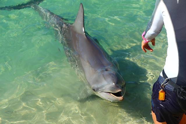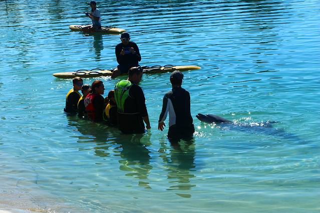 小孩子可以穿上泳衣到水里和海豚进行近距离的接触。