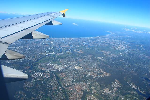 快到目的地了,路过黄金海岸,不过还要往前飞,心中还是挺不爽的。图中间靠海的那一排高楼就是黄金海岸市中心所在地。也是晚上我们住的地方,不知道我们住的是哪一栋楼呢。