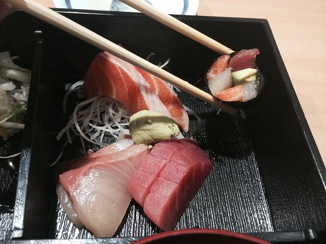 便当里面给了一个很可爱的小寿司,用海带卷上了各种生鱼片,挺有意思的。