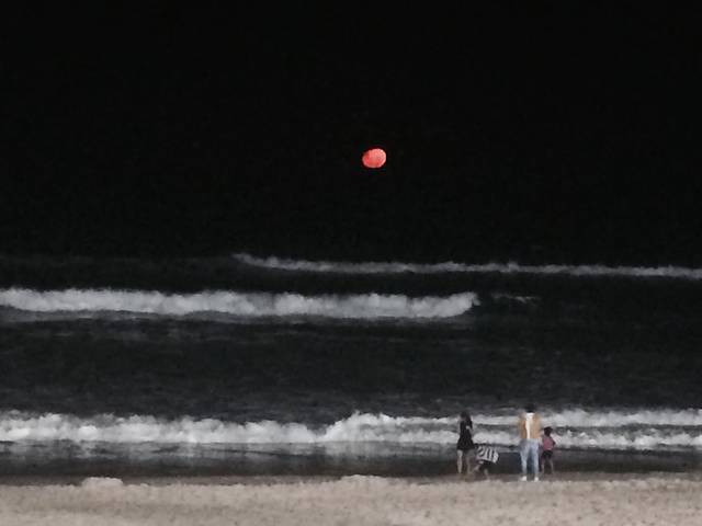 晚上海边的月亮是红色的,我们盯着看了半天才意识到这个竟然是月亮!一开始还以为是什么热气球之类的东西呢