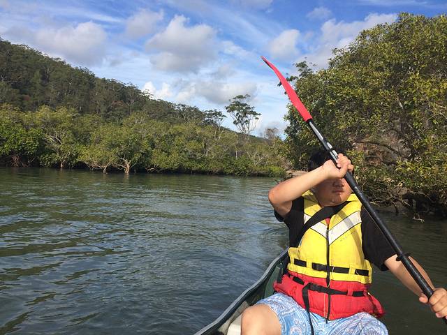 我本来没有报名,陪着小吃货一起过去问护林员可不可以也带上我,南澳来的帅哥二话没说,递给我一把桨就让我上了船,本来护林员帅哥是坐在我们船上的,结果后面一对母子不会划,翻船了...... 小哥就上了他们的船。我俩还算有经验,不过3个人的船只有咱俩,动力明显不足了,再加上小吃货对于交通工具完全零认识,还不听指挥,其实重担就落在我的身上了。我们一直处在掉队状态,不过还好可以在后面悠闲的拍拍照,开小差。
