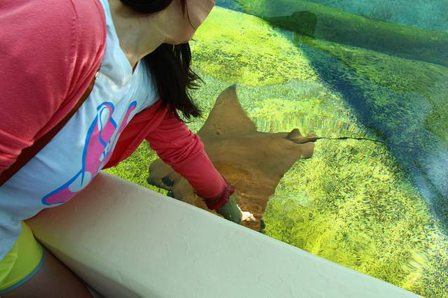两个表演地点离的还挺远的,中间会路过bay of sting ray,就是这种扁扁的蝠鲼。正好是喂食时间,可以花2刀买小鱼喂他们,还可以摸,不过只能摸两侧,不要摸头和尾巴,小心他蜇你。摸上去手感好滑的说.....