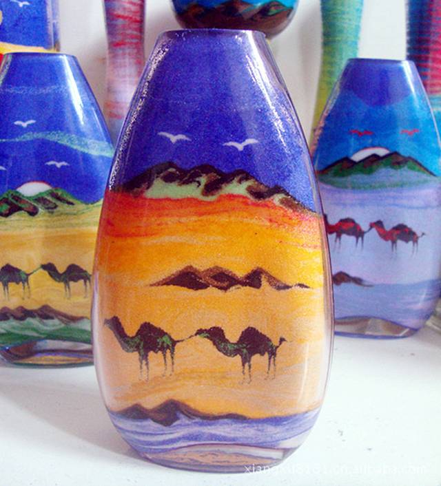 多彩细沙在细口玻璃瓶中勾勒出迷人图画,是约旦的独有的艺术。