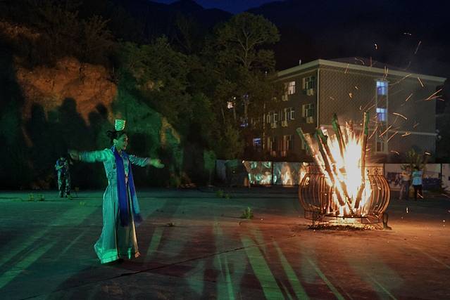 篝火晚会,夜晚的山庄,空旷幽静,宽阔的篝火场,热闹非凡。