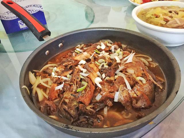 铁锅煎鱼,连着锅上啊,菜码大大的。大丰收沾胡椒粉吃也是醉醉的。