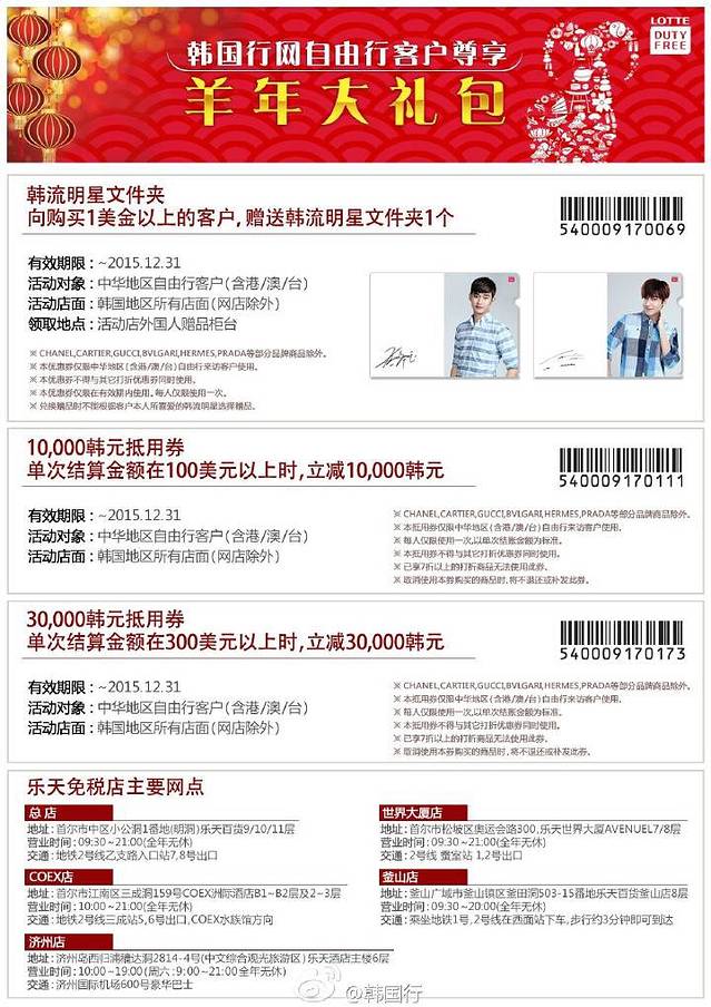 乐天免税店:我们去的是明洞的总店,实体店刷银联有九五折优惠,送的小样比较多,当然也是有优惠券礼包的。力度其实也不小。如下图:(可直接保存手机出示电子版)