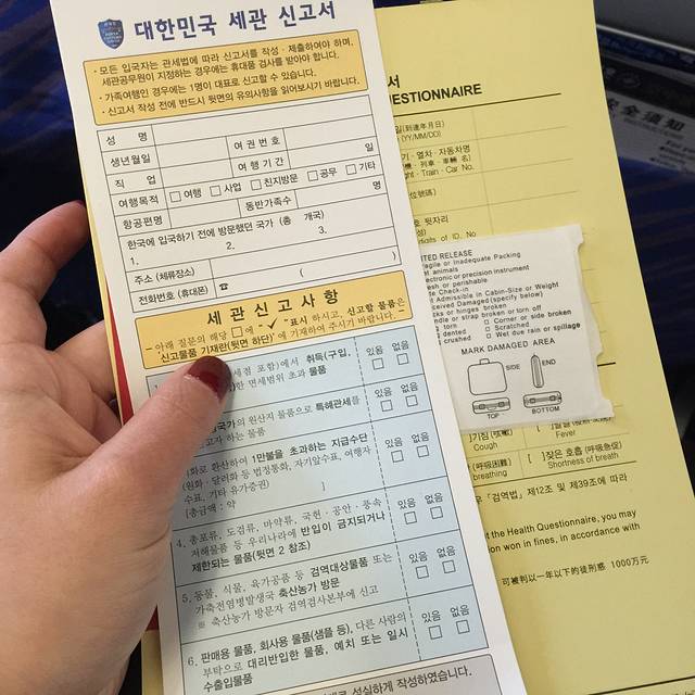上机的时候空姐会发入境卡,申报表和检验检疫卡,当时拿了也没在意,坐到座位上准备填的时候才发现空姐压根没给我入境卡,申报表也是给的韩文的。莫非把我当成了韩国人,哈哈哈。只能再拉着空姐问她要。
