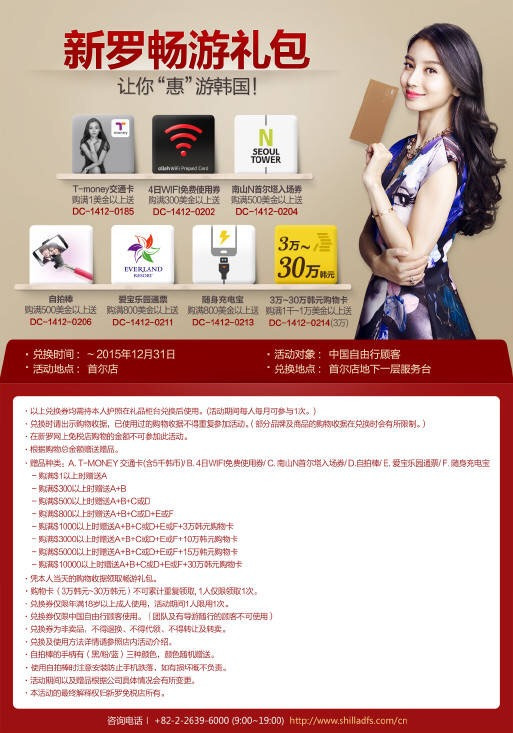 新罗免税店:打车去新罗免税店是可以凭发票去总台换相应额度的代金券的。这次订携程有送三万韩币的代金券+会员银卡(9-9.5折)+护手霜。折扣力度也很诱人。不过新罗免税店化妆品区有一个缺点就是不能使用不是自己名字的信用卡。如果使用非本人名字的信用卡,本人需在场。奢侈品店倒是可以刷非本人卡。