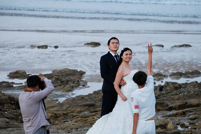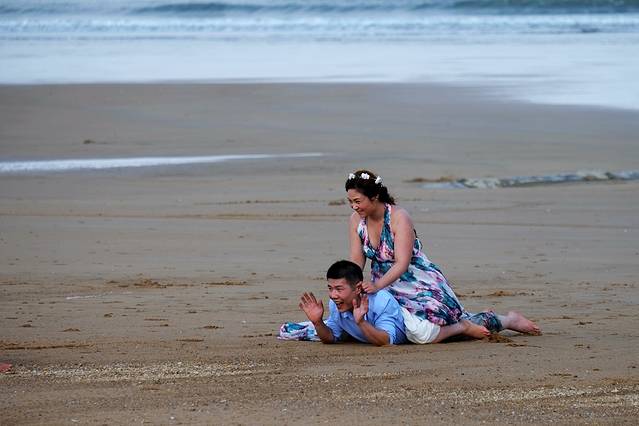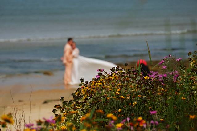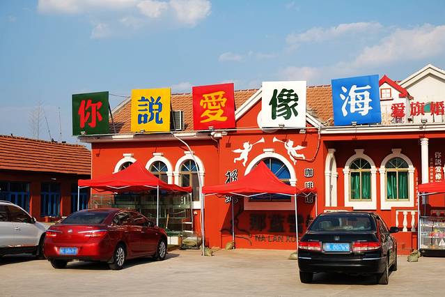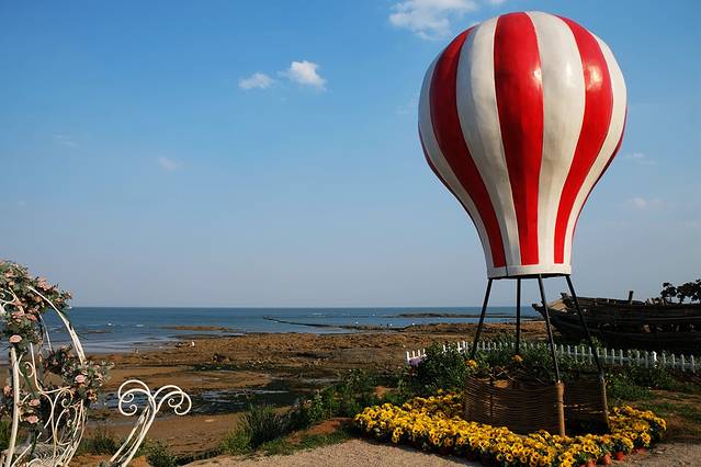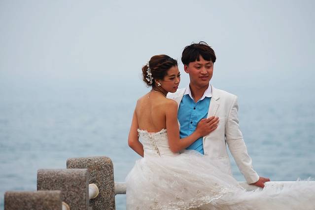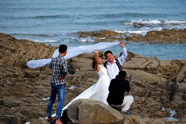 下午沿着海滨往南走,不远处的肥家庄有个婚纱摄影基地,纯属偶遇。这里在海边做了一些布景,拍照非常漂亮。