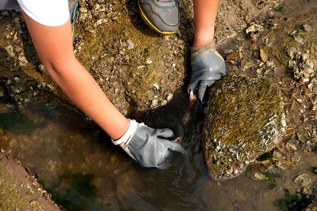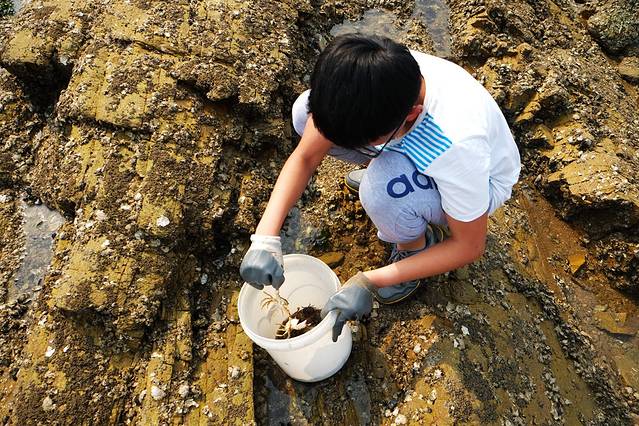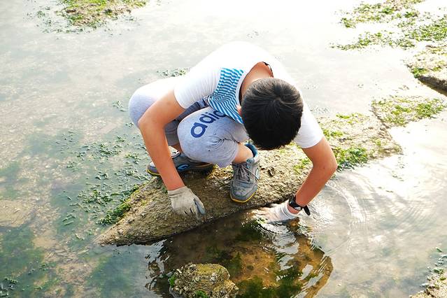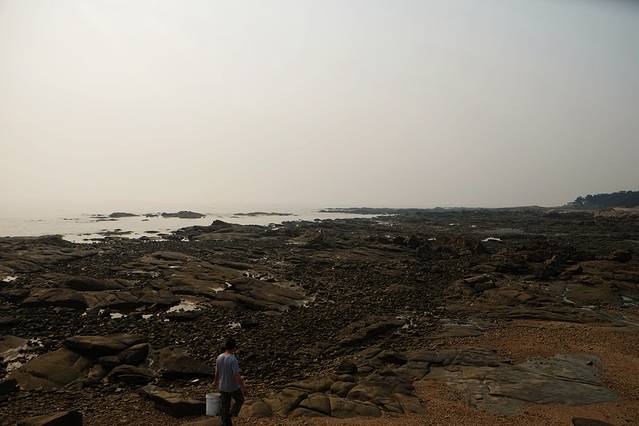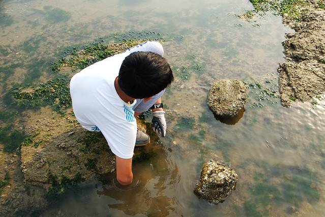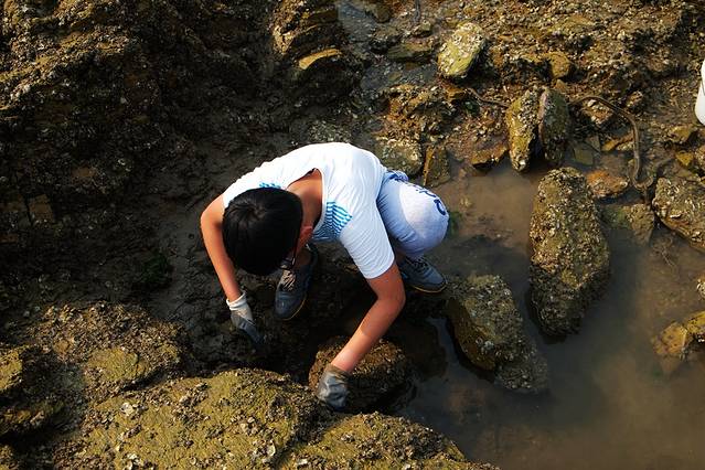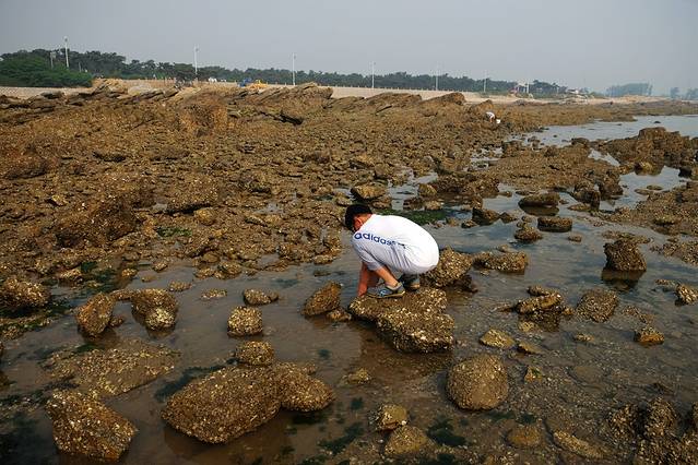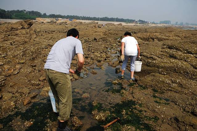 礁石上有很多牡蛎,但是太小了,这玩意儿还需要专门的工具敲,我们敲了几个,因为没有经验,觉得不好玩,还是决定去抓螃蟹。