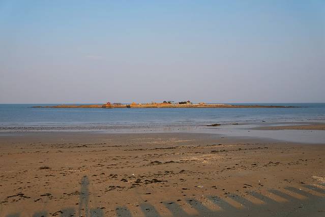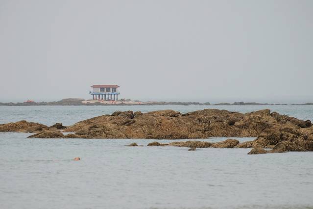 太公岛和第三海水浴场隔海相望,这里平时是一座半隐于海下的海岛,涨潮的时候只有岛顶和一个逃生塔露在海面上。潮后,整座岛就会浮现出来,并且露出大片的礁石,所以这里也是个赶海的好地方。