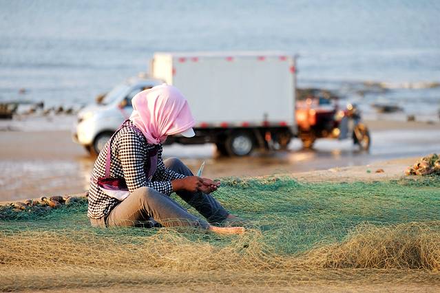 岸边的渔民正在补网,她上小学二年级的孩子正在旁边玩耍。开始这孩子还挺害羞,躲着我的镜头不让照相,后来熟了,摆出了各种姿势,不过我喜欢抓拍。