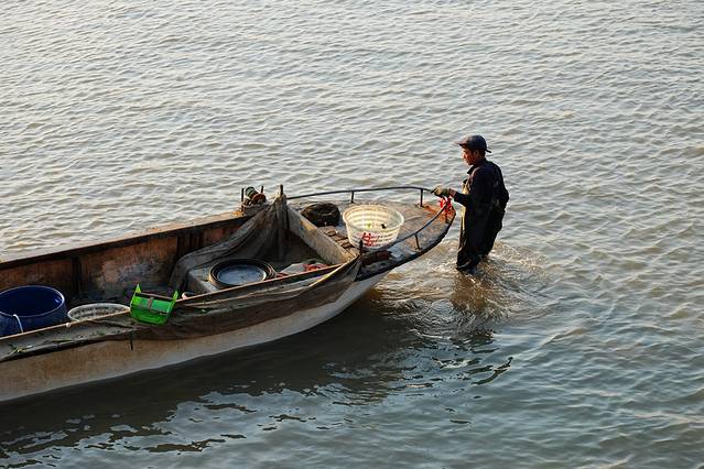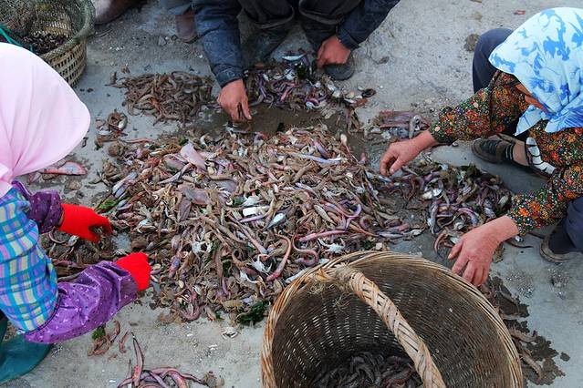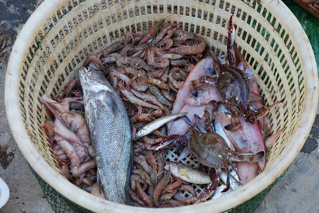 上岸后还要进行分拣,看着这一大堆蠕动的不明物体,我觉得这个工作好像比打渔还要麻烦一些。比较好的海鲜要挑出来,大虾最值钱,还有螃蟹和鱿鱼,确实收成并不是特别好的样子。