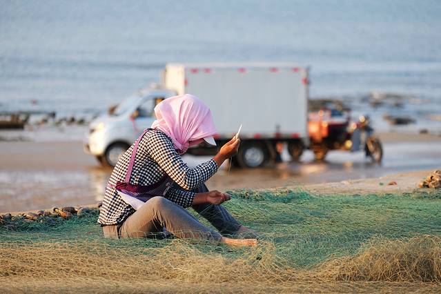 桃花岛对面的陆地上就是桃花岛村,这里的海域碧波荡漾,特产丰富,海滩上看到渔民正在收货。