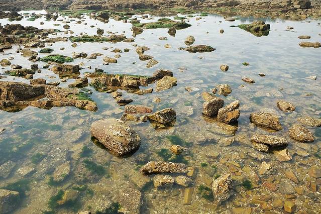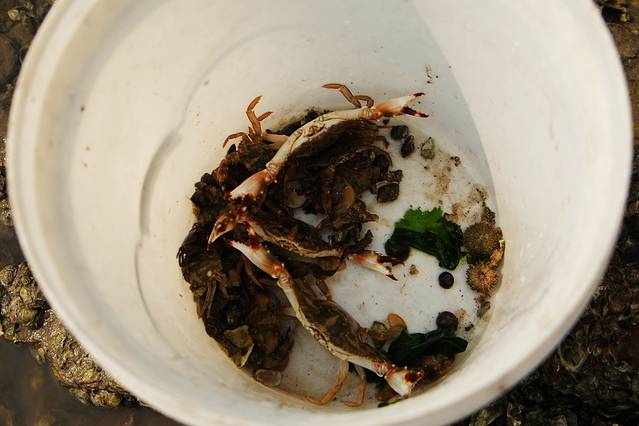 螃蟹都在水里的礁石下面,但是并不大,这都是退潮的时候没来得及逃跑的,于是躲到礁石下面等着涨潮,翻开水中小块的礁石就可以看见,当然要看运气,也不是每块礁石下面都有的。
