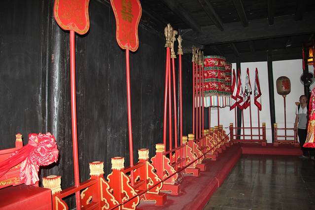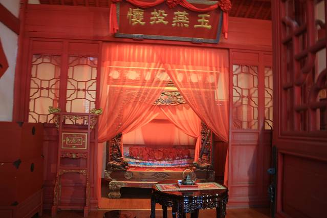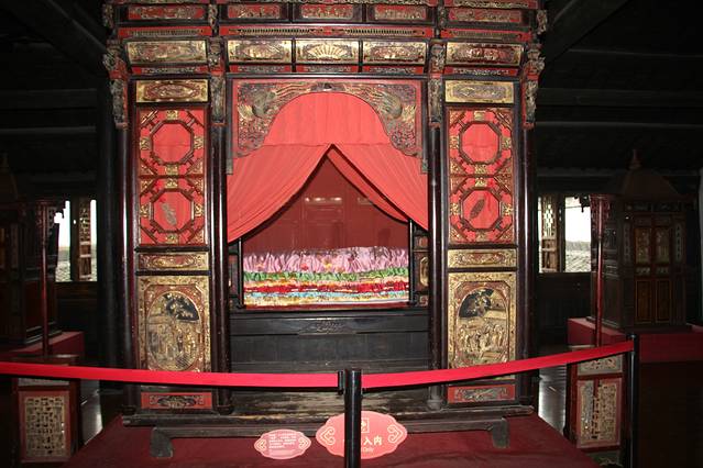 喜庆堂,这里面陈列的是乌镇的婚嫁习俗。应该说是富人的婚嫁习俗,像花轿、乐队、嫁妆还有婚床。这样声势浩大的婚礼,的确是觉得很赞,会吸引很多女生想来个“穿越”梦,但历朝历代还是平常百姓多,所以,像展览的拔步床平常百姓是做不起的。