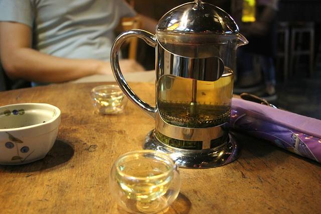 跟随着地图走了几个景点,我们先生觉得太枯槁,一定要坐下来喝喝茶。正巧“步步莲花”家路边有两个人座位空余,于是点了一壶绿茶,80元/壶;东西的价值要看它长在什么地方,帝王家的女儿就比平常百姓家尊贵,所以在乌镇的绿茶也比其他地方贵,这么贵的绿茶我以为会是龙井43……当然此时此刻,喝的不是茶,是闲云野鹤的心情。