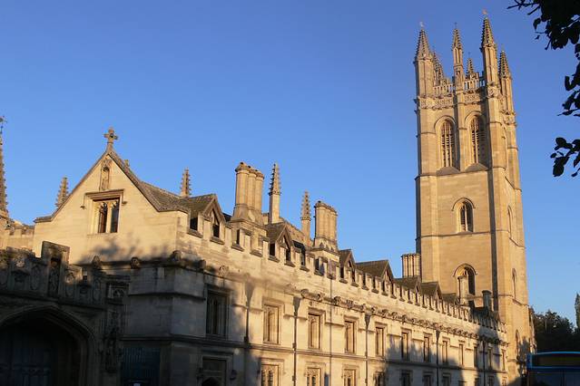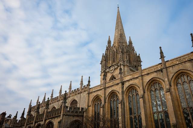圣玛丽教堂是牛津大学的主教堂,已经有近千年历史,建筑宏伟而华丽。这是一座后哥特式建筑,站在尖塔上可以饱览整个牛津的风光。门廊建于1637年,其螺旋立柱是英国建筑史上的一大创新。1645年的战争给门廊留下了弹痕。