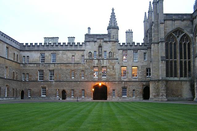 新学院全部主建筑第一次被设计成了一个彼此相连的整体,像修道院平面图一样井然有序。它的庭院差不多有默顿学院的方庭的4倍大。除了结构相近,这些学院还有一个共同的特点:挑战一切时尚,在学识和建筑上都一样。礼拜堂和食堂、门房和图书馆、内院和花园,构成一所学院的总是这些相同的因素,像一首巴赫赋格曲的变体。