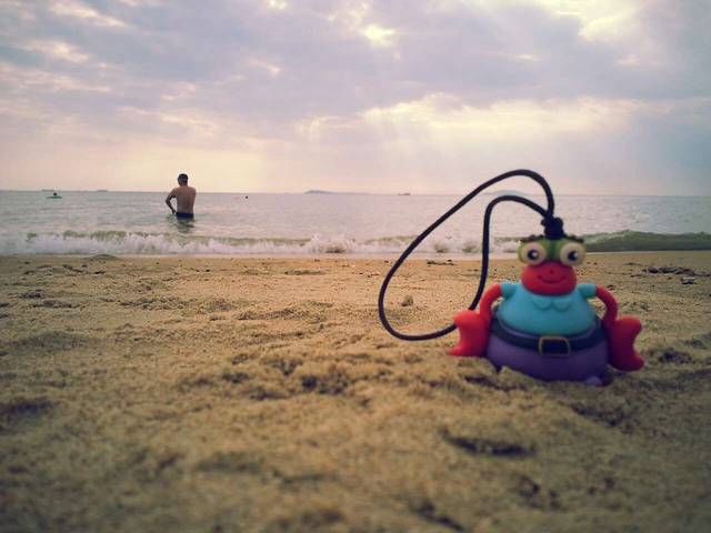 小小身影,提桶玩沙,海面如此辽阔,想象也飘在远方去了吗。