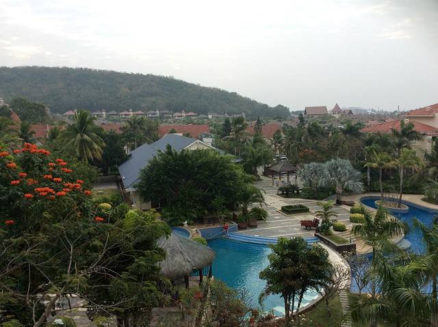 从酒店往下望。大姐介绍说,三亚市花是三角梅,左边红色的凤凰花也是海南的特色,北方没有,凤凰花看似热情如火,花语是别离。