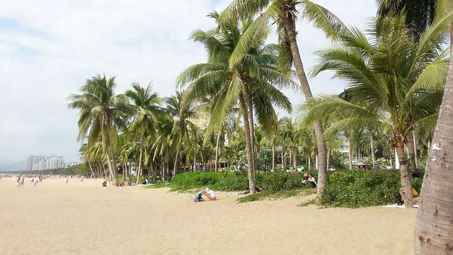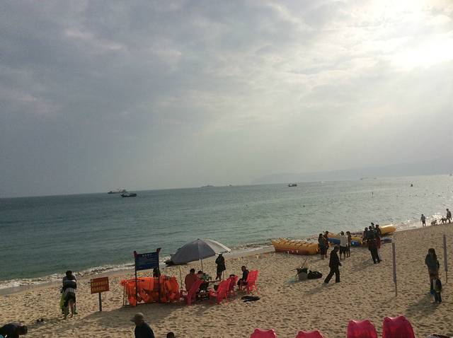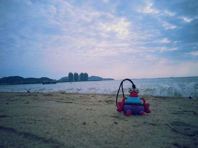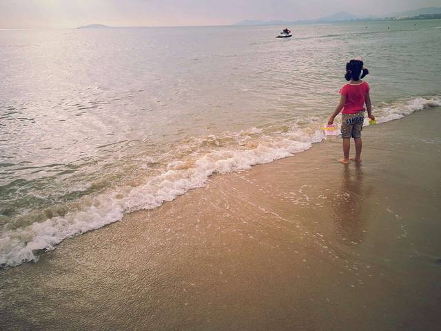 本来想去参加鹿回头之夜,结果下错公车,去往鹿回头公园是不能在鹿回头广场下车的。一定要在鹿回头村那边下。沿着电子地图走(我是小路痴一枚)。。。阴差阳错就走到了大东海,之前去的三亚湾全段很长,游人多,位于城市边沿,沙子粗粗黄黄,非常咯脚。大东海作为开发很久的老景点,很不一样,沙子非常细嫩,有一种古朴又规矩的美。
