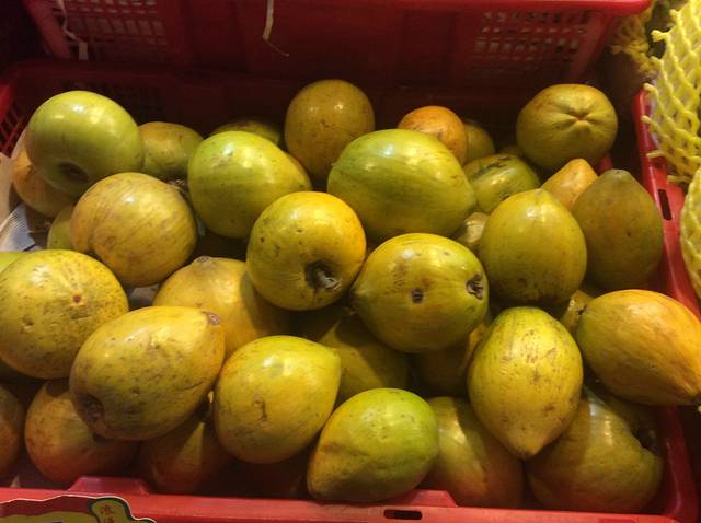 鸡蛋果。水果里的奇葩……5块一斤。还有蛇皮果,更奇葩。