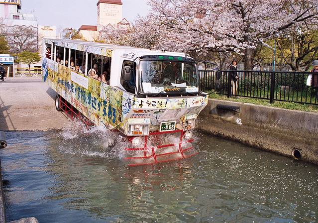 大阪独有的“水上巴士“,坐在大客车上冲进大河