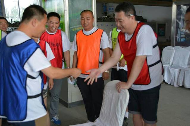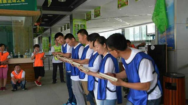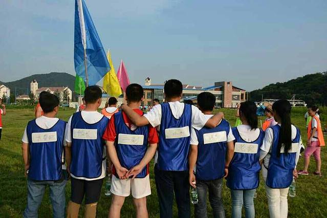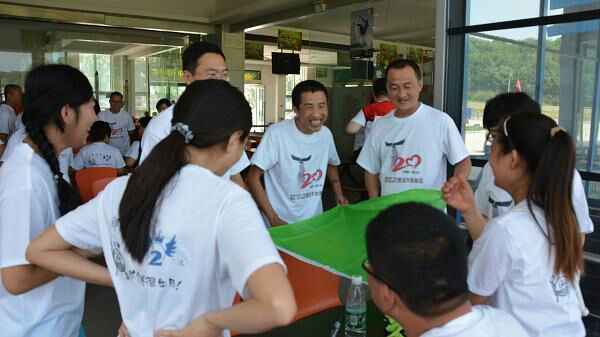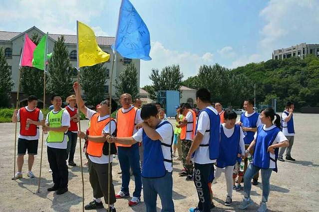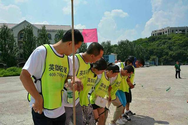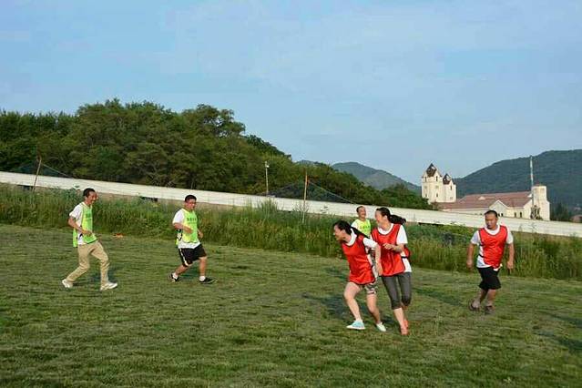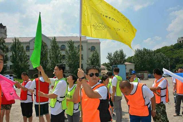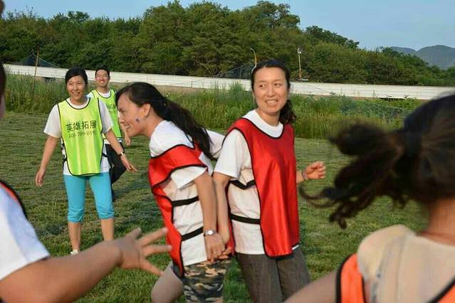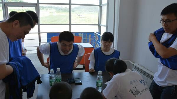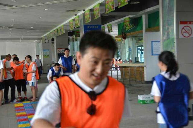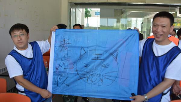 当天一共有七个游戏项目。第一个是蛟龙出海。虽然外面的太阳很大,但是大家高涨的热情更胜过了太阳呢。一个个斗志昂扬的走到了操场上。这个项目有点类似二人三足,不同的是不是往前走,而是要一组人两两脚绑在一起后横着走。教练给了10分钟练习时间。十分钟后开始比赛。经过一阵的摸索后慢慢有了头绪,似乎可以走的好一点了。欢子及时提供了意见,让大家更是有信心了。最后,我们列鹰队以0.5s的优势取得了胜利。最搞笑是老虎队,基本是跳着走,到最后都摔倒在地上,哈哈。