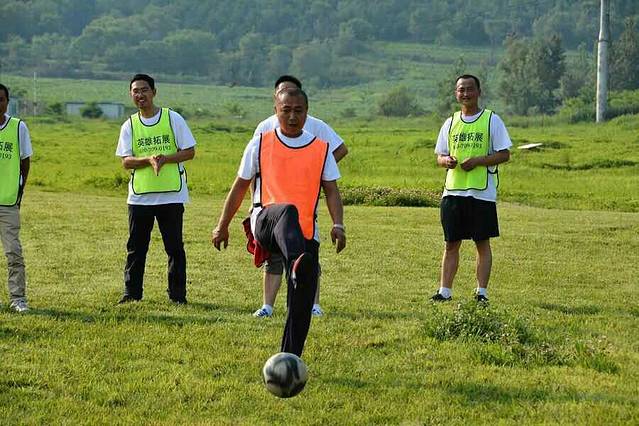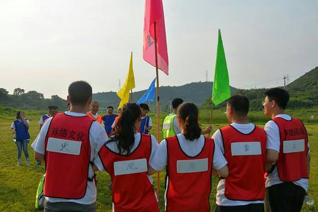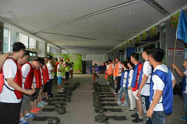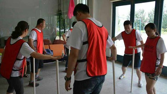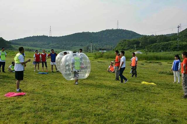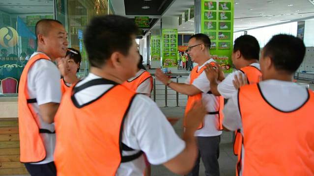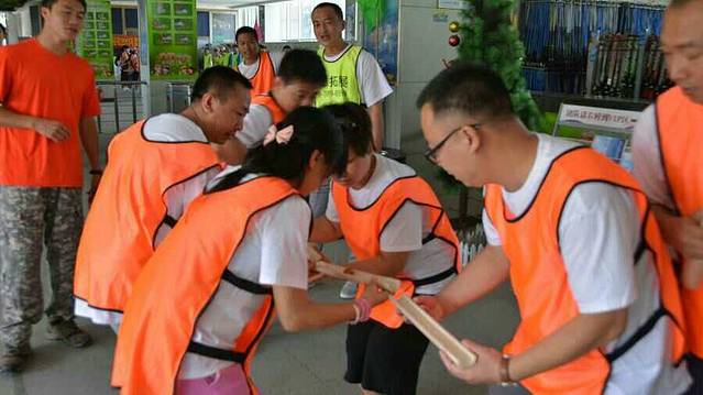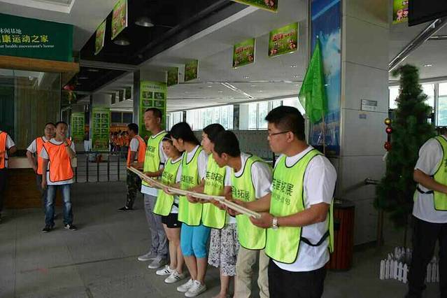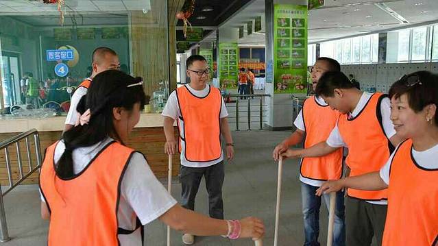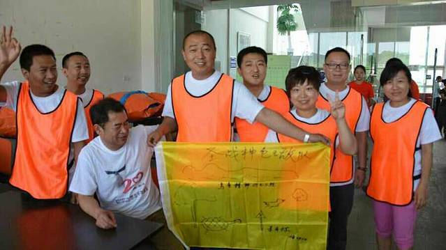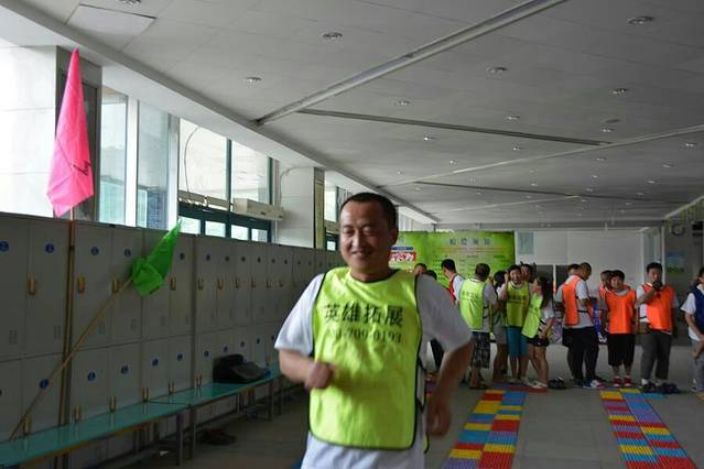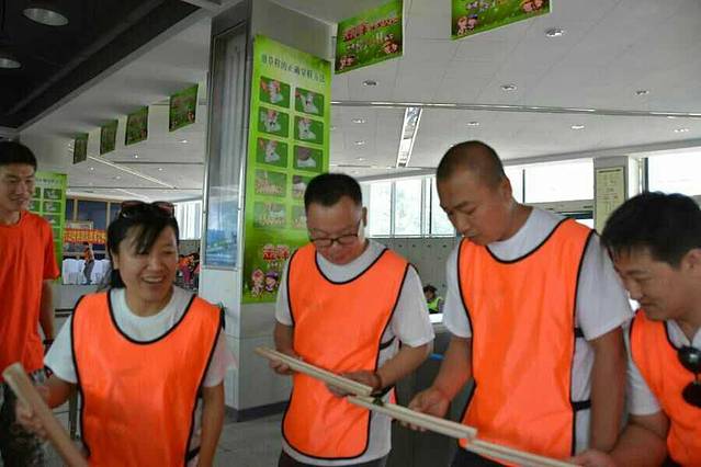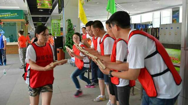 当天一共有七个游戏项目。第一个是蛟龙出海。虽然外面的太阳很大,但是大家高涨的热情更胜过了太阳呢。一个个斗志昂扬的走到了操场上。这个项目有点类似二人三足,不同的是不是往前走,而是要一组人两两脚绑在一起后横着走。教练给了10分钟练习时间。十分钟后开始比赛。经过一阵的摸索后慢慢有了头绪,似乎可以走的好一点了。欢子及时提供了意见,让大家更是有信心了。最后,我们列鹰队以0.5s的优势取得了胜利。最搞笑是老虎队,基本是跳着走,到最后都摔倒在地上,哈哈。
