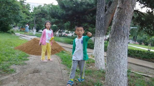 我们在一舍前停留了下,两头对松果很有兴趣,轩轩也下车去捡松果呢。我记得上次从学校回去两头也是带了很多松果,大姐还特别给了他们一个漂亮的袋子用来装的。
