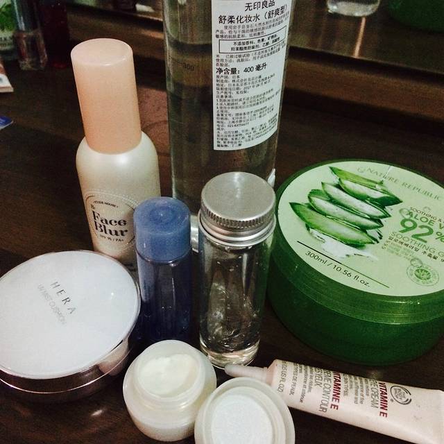 基础护肤系列!爽肤水及芦荟胶用小瓶分装部分就可以了(蓝色小瓶装爽肤水、玻璃瓶装芦荟胶)