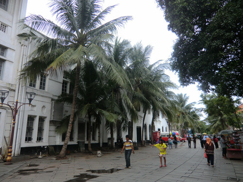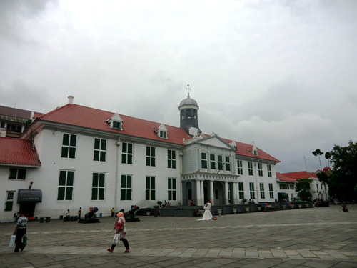 沿着Jembatan Batu大街一路向北步行一百多米,便到了哥打老城的中心市政广场(Taman Fatahilah Kota Tua)。广场周边可能是雅加达乃至整个印度尼西亚维护的最好的荷兰老城区之一,现在已经作为步行区禁止机动车入内。广场卵石铺地,呈四方形,各殖民时代的荷兰老房环绕四周,令人不由联想到了欧洲城市的市政广场。