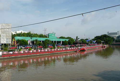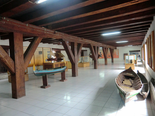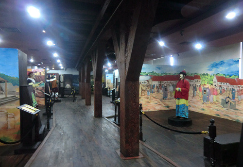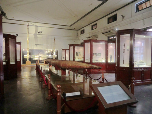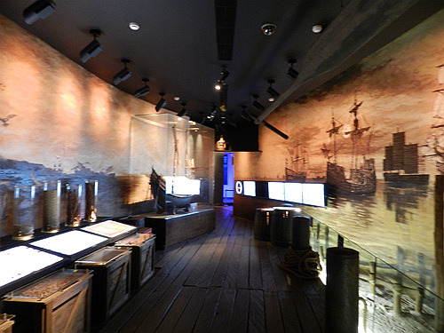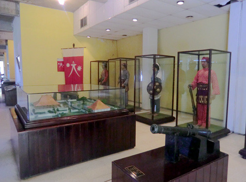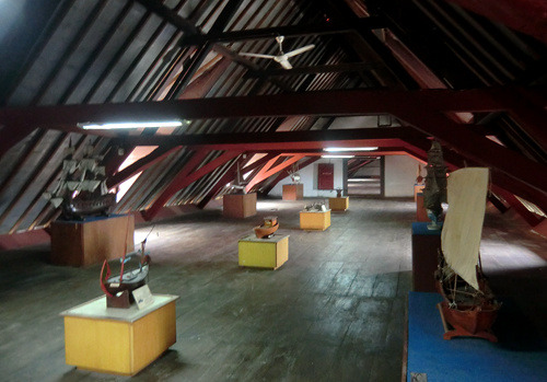 瞭望塔的对面就是门票5000印尼盾的海事博物馆,那里自17世纪以来一直是荷兰东印度公司的货栈,货栈北墙就是当年巴达维亚的城墙,至今城壕环绕,岗亭与炮台林立,看起来如同一个小型要塞。这里是昔日荷兰东印度帝国荣光的缩影,因此建筑面积硕大无朋,今日的海事博物馆使用的面积还不到昔日建筑的三分之一,大量闲置的空间使得这里显得空荡荡的。博物馆的展厅都是当年货栈的仓房,粗大的木梁下悬挂着一块块展板,显得有些陈旧而简陋。这里简单的介绍了印度尼西亚这个千岛之国始自史前时代的海洋史,还专门有一个很简陋的海军展厅。博物馆最精彩的陈列就在入口玄关的楼上,香料、白糖、石油,赤道翡翠东印度群岛丰富的物产吸引着中国、欧洲、日本等一批批的外国人在这里你方唱罢我登台,展厅用一个个生动的场景介绍了这些外国人与当地人一道上演的一场场历史大戏。