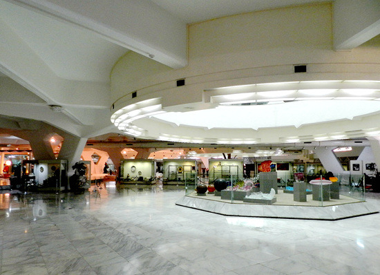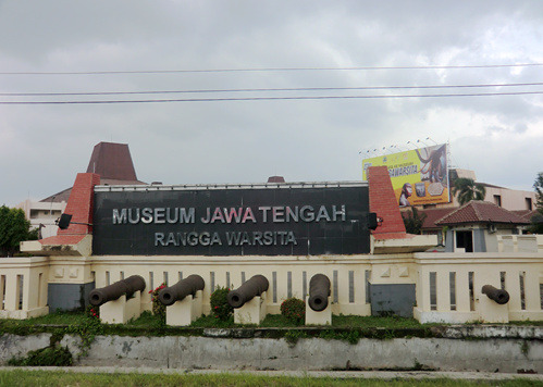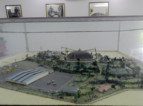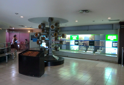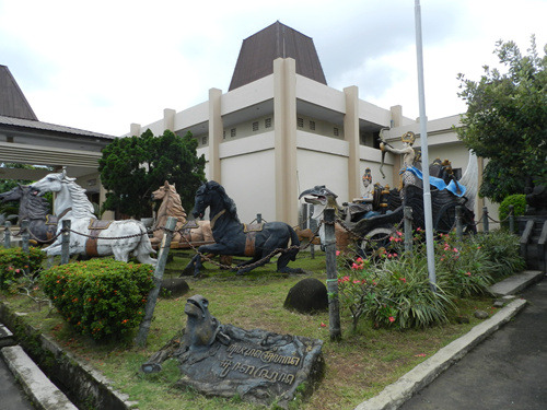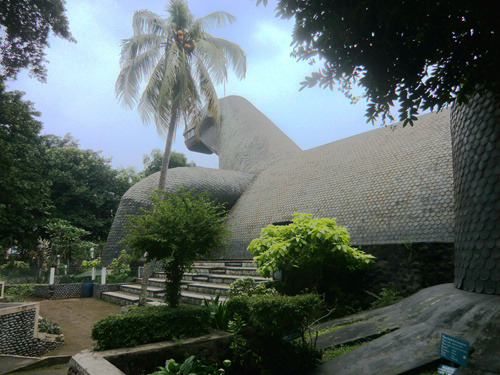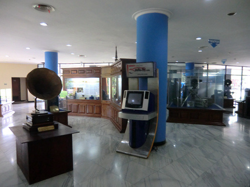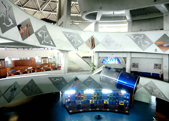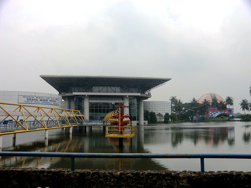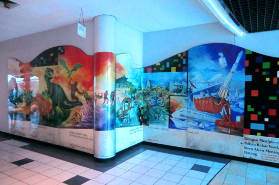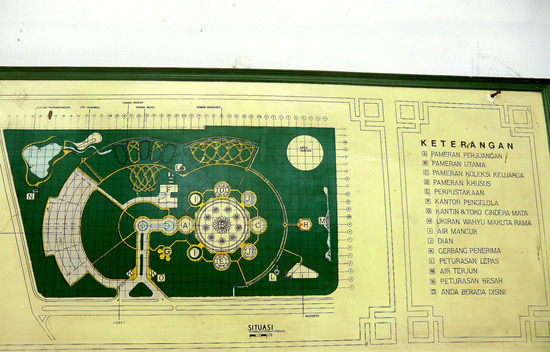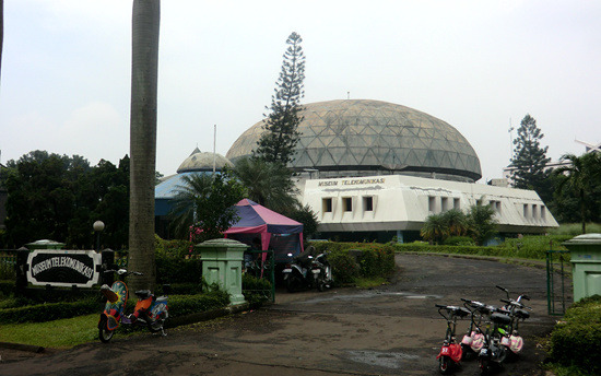 本日印度尼西亚特色博物馆之旅从通讯博物馆开始,它位于印度尼西亚缩微公园的正门、也就是西门口,门票2000印尼盾。这是一栋带有天文台式巨大穹顶的建筑,以上世纪80年代第三世界标准衡量挺时髦,不过现在看来就有点过时了而且显然急需修缮——到处都在漏水。陈列内容倒也全面丰富,从最顶层爪哇古代的各种原始通讯形式,历经荷兰殖民时代的发展,直到最近的卫星电话,但昏暗的室内光线使得这一切都看不大清楚。旁边那个足球外形的印尼体育博物馆则干脆就不开门了。