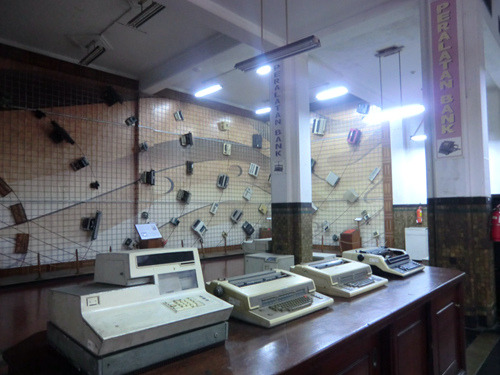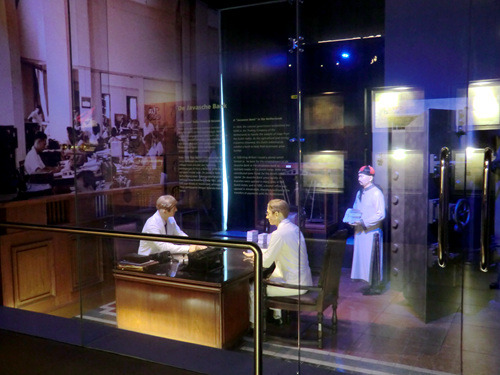 当然,除了印尼的百年金融史外,这里也有那种其他金融博物馆该有的陈列:印尼从古至今的各种钱币(从室利佛逝的古老钱币直到本世纪最新的纸币,也包括日占时期的军票),印尼流通钞票的各种防伪技术,以及来自世界各国的钱币。当然,最令人赞叹的还是金库,就如伦敦的银行博物馆一般,你也可以隔着玻璃看看一堆金砖(真伪未知),还可以把手伸进洞里亲手掂量一下金砖的分量(同样真伪未知)。