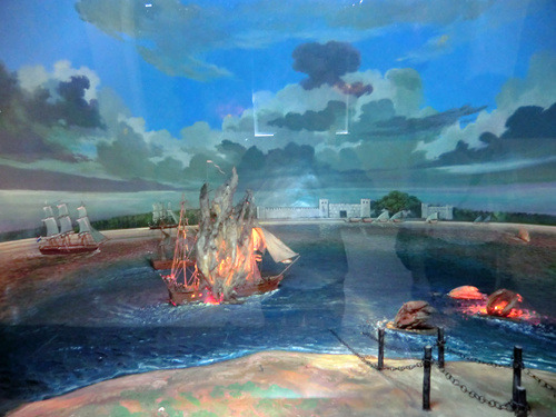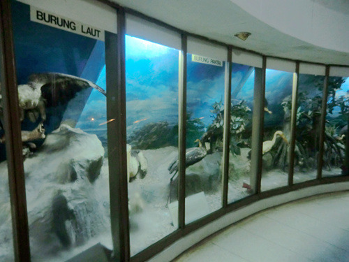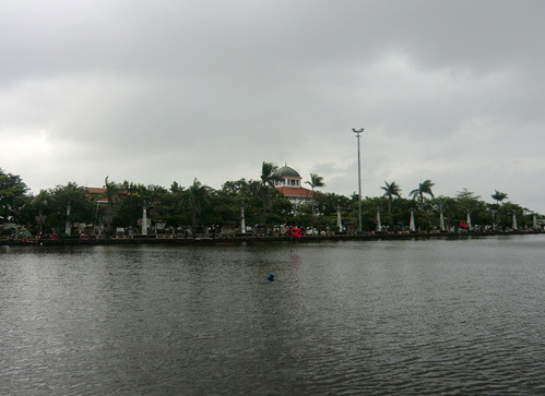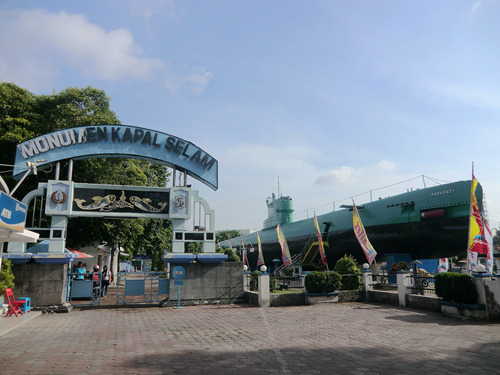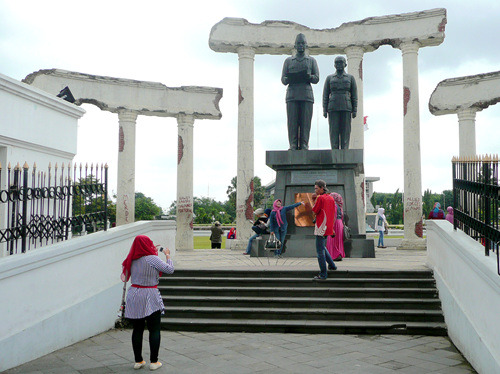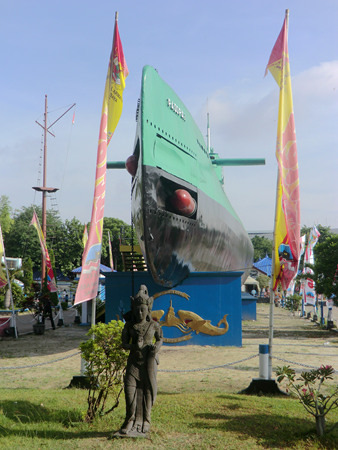 飞碟的西侧是一个人工湖,湖心屹立着一座城堡,那是门票2500印尼盾的海军历史博物馆。印度尼西亚作为一个千岛之国,可以说自古以来就是一个海洋国家……或者说一大票海洋国家的聚合体。这些苏丹国就如被装在一个大口袋里的一群小猫,时而彼此贸易,时而互相开战,直到有一天荷兰人来了,自西向东的把他们一个接一个统统征服。这个博物馆里介绍了苏丹国之间的内讧,但重点还是放在了与荷兰的几次战役上——打得很悲壮,但最后都是以失败告终。在这里你可以看到海战的缩微场景、战场沙盘、以及各个苏丹国海军将士的蜡像——看上去似乎与海盗也没啥太大差别嘛。