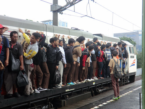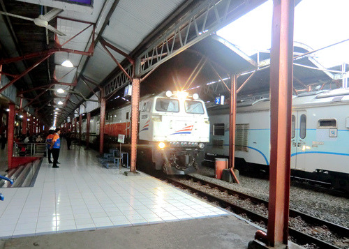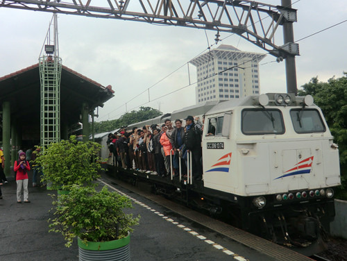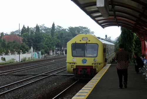 兴冲冲起个大早,向窗外望去登时一头冷水泼浇下来:只见得窗外大雨倾盆而下,路面积水盈尺。等了等不见雨势减弱,一咬牙一跺脚,冒着大雨直奔雅加达市中心的火车站Gambir而去。一路上莫说是普通私家车,便是走公交专用通道的快速公交也被这大水困做一团而动弹不得了。平日只需半个小时的路程,这次用了足足两个多小时,直到九点多才蹭到。本以为这下子定然赶不上八点多发车的火车了,结果雨季的印度尼西亚再度出乎了俺们的意料:火车也因为大雨而晚点了,直到现在还没进站呢!