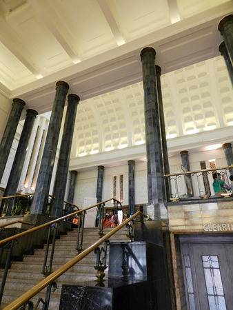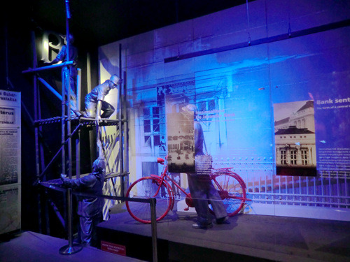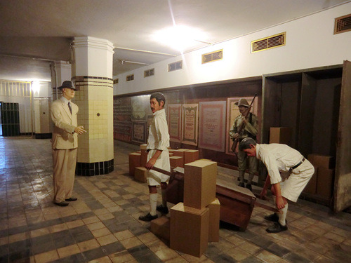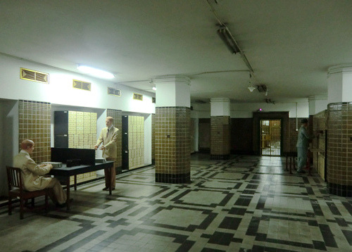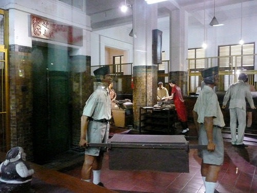 不过还是别管什么陈列了,好好欣赏这栋建筑本身与场景复原吧,如果不在意模特人像断手指破耳朵这样的小细节,那么营业大厅的场景复原还是相当有视觉冲击力的——让人立刻联想到了沈阳的金融博物馆营业大厅那个热闹而壮观的场景复原,只是规模大了两倍以上。不过这里最了不起的还不是营业大厅而是地下金库。长期以来,俺一直以为银行的地下金库只是一个大点的房间而言,大小规模完全不可与地面部分同日而语,但是今天俺的印象被彻底颠覆了,这个地下金库规模极为庞大,结构极为复杂,简直就是一个地下的米诺斯迷宫。金库的各个房间也同样做成了场景复原,再现了一个世纪以前的场面……在啧啧称奇的时候还请务必当心地面,由于雨季的缘故地下金库里有不少地方积水严重。