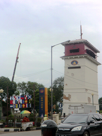 归根到底,荷兰时代的巴达维亚乃是一个大海港,欧洲大航海时代的辉煌直至今天也还有些落日余晖的遗迹可循。自哥打老城中心,沿着克鲁库特河(krukut)一路向北,路过著名的历史景观雅加达唯一幸存的荷兰吊桥鸡市场桥(chicken market bridge)之后便来到了建于1839年的瞭望塔(watchtower)。这里与其说是一座指挥交通的瞭望塔,还不如说是一座军事要塞小型炮台,扼守着克鲁库特河与运河的出海口,直到现在也还摆着几门大炮,如今这里是印尼海洋博物馆的分馆,门票5000印尼盾——说真的,除了可以爬上楼顶看看周围风光之外,这里一无所有。