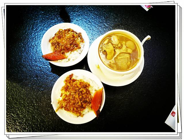 第一站,我们决定去吃著名的胡须张卤肉饭。曹小胖同学还要了一碗佛跳墙,老实说,和我想象中的佛跳墙相差甚远,印象中的佛跳墙应该是炖肉之类的,这个佛跳墙很古怪。味道我觉得很是一般。卤肉饭那,稍微有点甜,似乎台湾卤肉饭都是没有卤蛋的,和北京鹿港小镇之类的茶餐厅相差甚远。卤肉基本都是肉末,还有一些洋葱,我想说的是盛名之下其实难符啊。我们要的是最小碗的,因为还要留着肚子吃别的,嗯,33台币一碗,人民币也就不到10元吧,佛跳墙99台币,觉得不值。可以在中山地下书城买本叫宁夏夜市的书,按图索骥,据书中推荐,胡须张的苦瓜排骨汤是比较好喝的。
