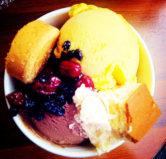 蛐蛐同学排队半小时买的冰激凌,巧克力和香草口味,送了一个土凤梨酥和小块的起司蛋 糕。天气有点凉,不太适合吃冰激凌啊,不过看到大家都排队买,我就咬牙坚持吃啦。