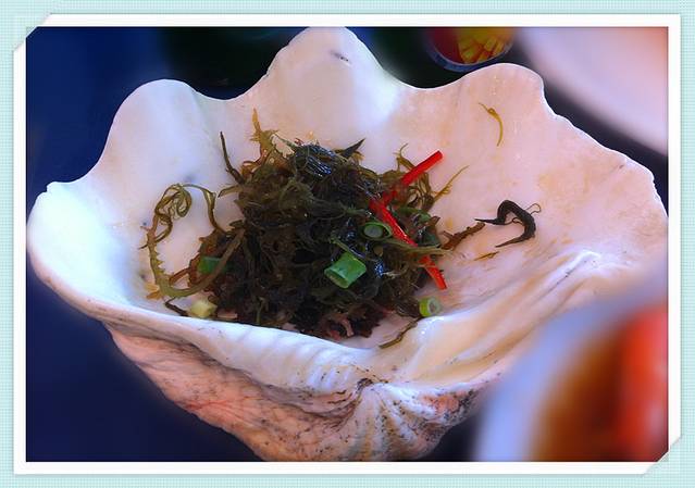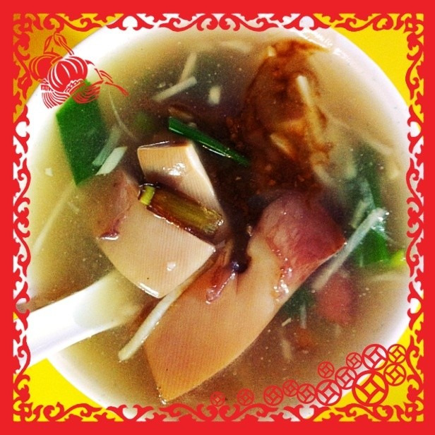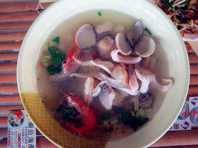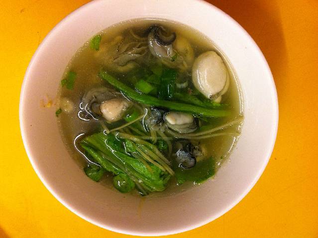 这个是蚵仔汤,味道倒是很鲜美。据说老板只加了葱姜丝和茼蒿菜,再加点香油即可了。从照片看,蚵仔还是挺大的哈(蚵仔煎和蚵仔汤都是60台币一份 )。