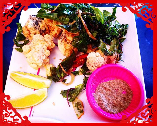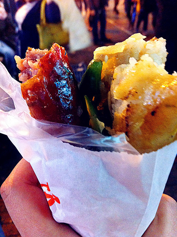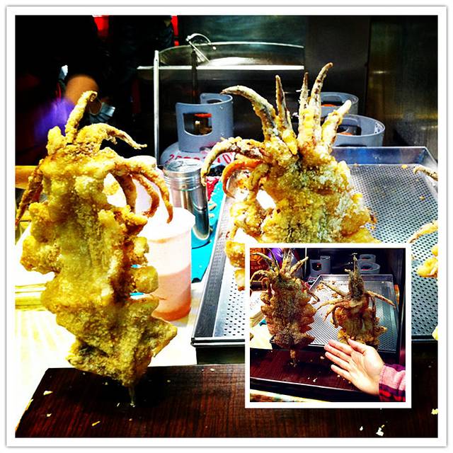 蛐蛐同学还是直奔山东赤肉蒸饺,吃了两屉后被我强行拽走,还有别的好吃的没吃,不能把肚子都浪费在蒸饺上。我又去吃了里长伯臭豆腐,也只吃了一份,不敢多吃,没有肚子了。然后俺们两个没出息的,又去吃了油炸大鱿鱼。事后都后悔不已,这东西太占肚子,但是当时怎么也忍不住不去吃啊。