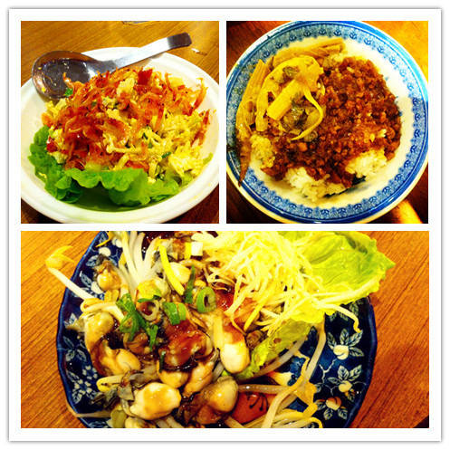 中午我们是在永康街的大来小馆吃的。这是台湾自由行微博推荐的,生意很好,我们还要和别人拼桌吃。点了樱花虾笋干,蒜泥蚵,卤肉饭。味道不是特别的惊艳,算是中规中矩吧。