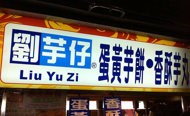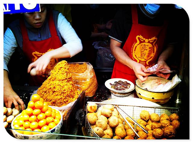 刘芋仔恐怕是宁夏夜市里最火的摊位了,要想吃到这个摊子的蛋黄芋饼和香酥芋头,不排队半小时左右是绝对吃不上的。据说所用的芋头全部来自高雄甲仙,从削皮,清洗,蒸熟到揉捏成芋泥,全部手工制作,需要花上6到7个小时。蛋黄芋饼是在芋泥里包上咸蛋黄和肉脯再下锅油炸。香酥芋丸则是用用冰激凌圆勺把纯芋泥挖成圆球下锅油炸。