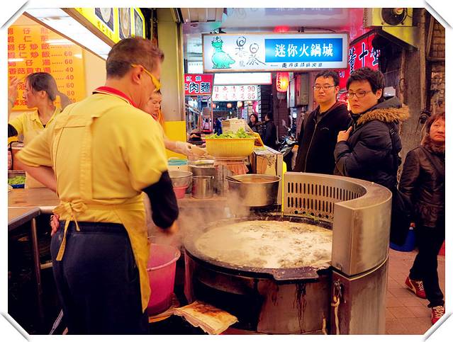 这个是蚵仔煎大王的店员在做蚵仔煎,猛一看,有点像北京街头摊煎饼,就是锅超级大了些,哈哈。