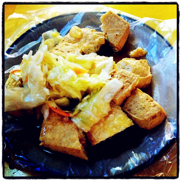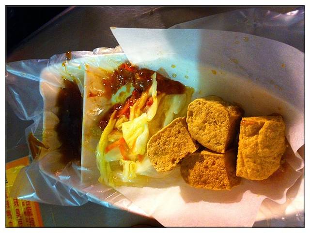 这家的臭豆腐就是炸豆腐加圆白菜。豆腐的味道一般,圆白菜就像普通的炒圆白菜一样,由于汤汁较多,臭豆腐都不香脆了,唉,实在令人失望,不过宁夏夜市里确实有超好吃的臭豆腐,在以后游记里会提到啊。