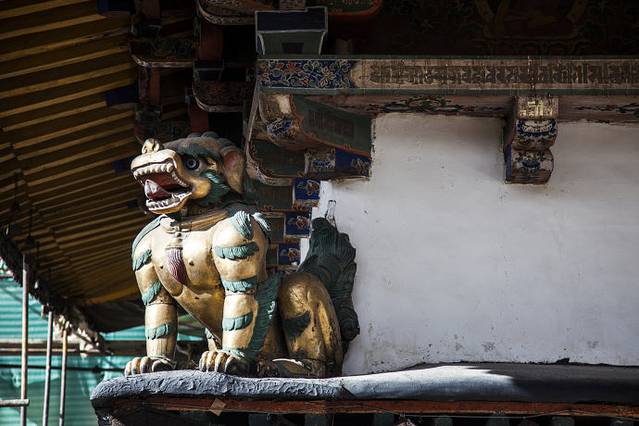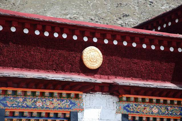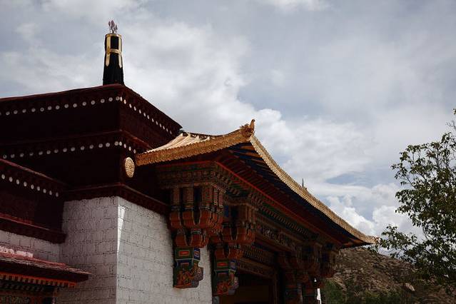 下午去了色拉寺。到色拉寺的时候时间还挺早的,色拉寺最重要的节目还没有上演。来色拉寺的游客,大部分人是冲着辩经去的,而辩经是周一到周五的下午三点开始。因为色拉寺的大殿这一个时期正在修缮,不对外开放,所以先去了它的一个札仓,叫切札仓。藏传佛教虽然也是佛教,但与内地的佛教有太多的不同,一般大的寺院,分为寺院、札仓、康村三个级别,札仓就是中等级别的。此外内地的佛殿,供佛之外,基本就是人们参拜的地方,也就是说,僧人学习讲经的经院与神殿是分开的。而藏传佛教的佛殿基本上是合为一体,神殿也是经院,也是一个教育培训的场所,除了供奉的佛像外,还有很多喇嘛学习和听讲的座位。这座札仓虽不是色拉寺的主殿,其实也挺宏伟,里面有很多精美的佛像。前文说过,因为对于佛教外行,对藏传佛教更是外行,进去之后根本分不清楚那一尊像塑得什么佛。是佛教“原产地的”佛,也就是释伽摩尼和他的追随者;还是在西藏转成的佛,藏族本身“自产的”佛。不管是什么佛,殿里的佛像都是那么的鲜艳威武。看了西藏的佛,感觉和内地的佛也不太一样。内地的佛很安祥,慈眉善目,而且佛大都色彩庄重,基本上都是金色,没有太多花哨的颜色。而西藏的佛大都色彩鲜艳,五色俱全,而且面目上瞠目严口,显得有些严厉。不过入乡随俗,咱们进了人家的门,就跟着别人一样的敬,一样的拜,该投钱的地方,也跟着扔几块钱的零钱。